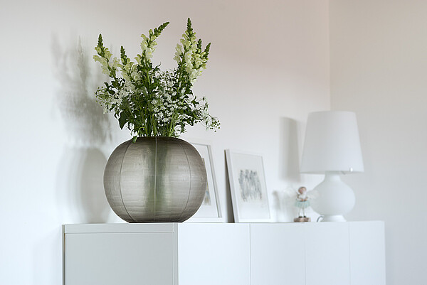 Das großzügige Einfamilienhaus in Karlsruher Höhenlage wurde über einen langen Zeitraum eingerichtet. Die intensive Zusammenarbeit zwischen der Kundin und der Architektin der Firma burger hat ein Haus mit besonderem Flair geschaffen. Die Farbgestaltung wurde einfühlsam auf die Umgebung abgestimmt. Weiss, beige und Naturtöne runden die Möbilierung mit den Klassikern der Moderne ab. Kunst, zufällig Gefundenes auf Reisen und Kleinobjekte spiegeln das Leben der Hausbesitzer wider.